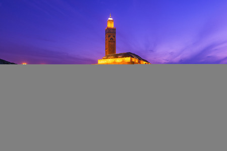 Casablanca, biggest city in Morocco. Hassan II Mosque night illuminated view.