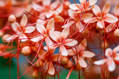 Closeup of Pagoda Flower Clerodendrum paniculatum tropical flowers with soft peach petals and red stamens in natural floral background