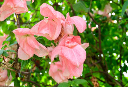 Bunch of Fresh Old Rose Mussaenda Philippica or Donna Queen Sirikit Flowers on Green Tree.