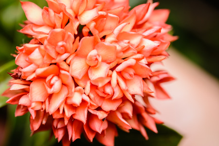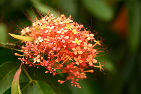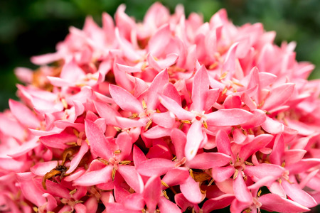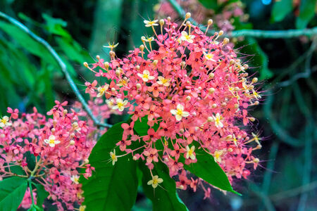 The flower clusters of Ixora finlaysoniana in red color of blooming stage.