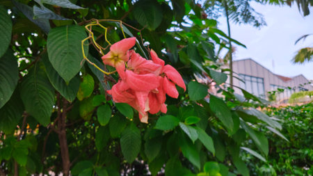 close-up view of a pretty pagoda flower. the color is red and has a unique shape resembling a temple. We often encounter this flower in Wonosobo, Indonesia. Pagoda flowers are often planted in front o