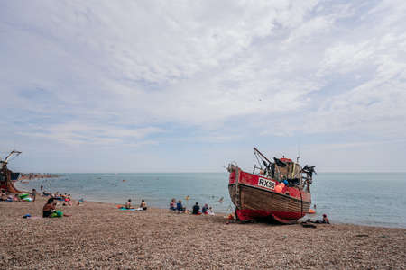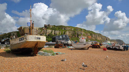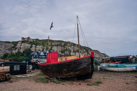 Hastings Port, East Sussex / UK - 2020.08.08: Hastings fishing boats on the beach at Rock-a-Nore