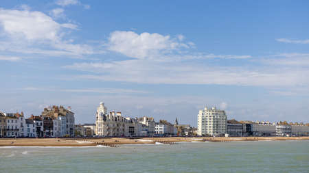 Beautiful landscape of Hastings in England. Spring cloudy cityscape.