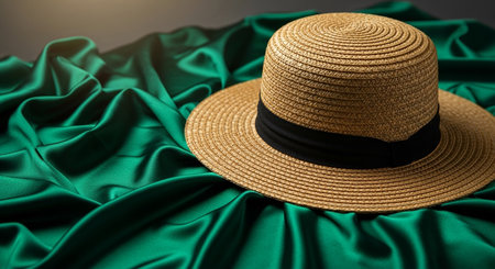A straw fedora hat with a black band rests on draped, luxurious emerald green satin fabric.