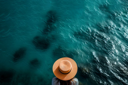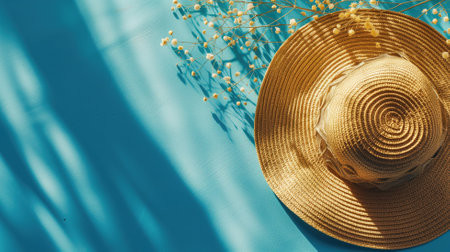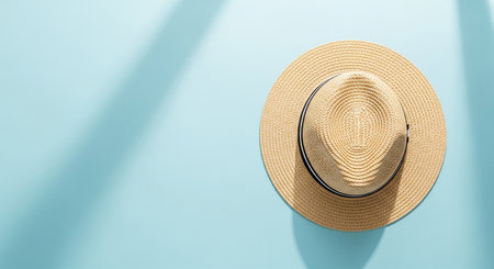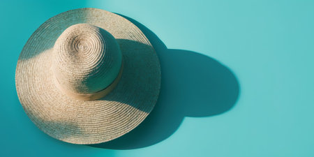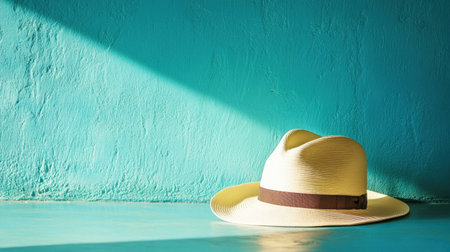 A stylish straw hat elegantly rests on a turquoise surface, casting soft shadows in bright natural light. This minimalistic composition evokes relaxation and summer vibes.