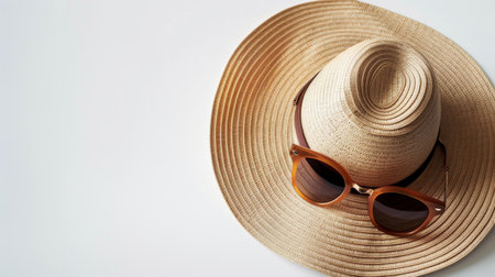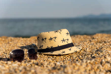 Straw summer hat and sunglasses at the beach. Fashion and accessories concept