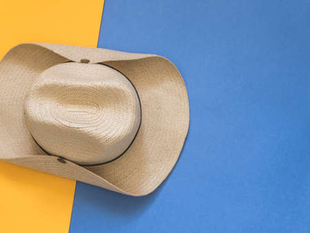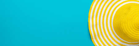 Top view of yellow hat close-up over blue background. Minimalist photo of striped retro hat with copy space.