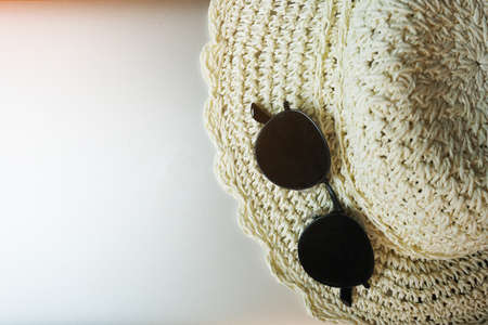Sunglasses and white hat on the grey table.