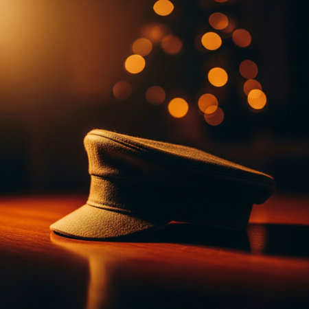 Black hat on a wooden table in front of the Christmas tree.