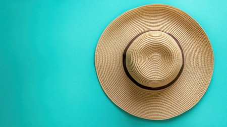 This stylish straw sun hat rests on a vibrant turquoise background, perfect for adding a bright touch to summer fashion and beach outings.
