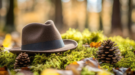 A cozy brown felt hat rests on lush green moss, accompanied by pine cones, creating a serene autumn scene in a tranquil forest setting.