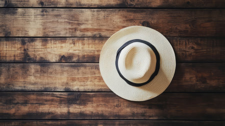 An elegant wide-brim hat on a textured wooden background with soft lighting, leaving space above for creative messaging.