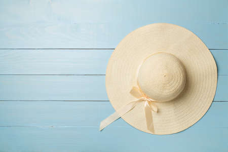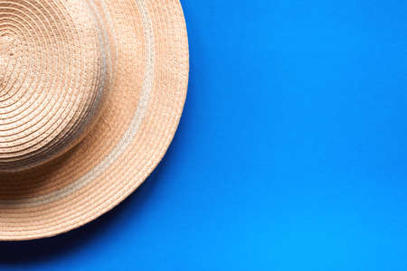 Pretty straw hat for outdoor. On blue background, beach hat, top view