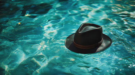 A dark leather hat floating on clear turquoise water with sunlight reflections, creating a tranquil and mysterious atmosphere. Fashion and leisure concept
