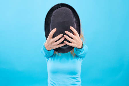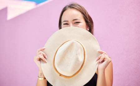 Travel, fashion and summer hat with a woman tourist in the city on a pastel color pink wall background. Happy, holiday and tourist with a female traveler covering her face with a sunhat in town