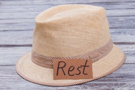 Beige straw hat for rest on the beach. Dark wooden desk surface background.
