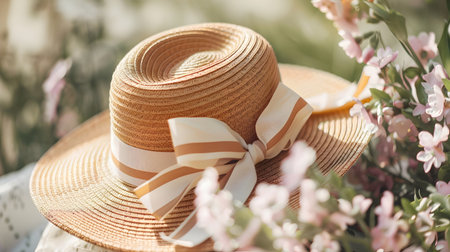 Stylish straw boater hat with a striped ribbon perfect accessory for a spring picnic or any outdoor leisure activity