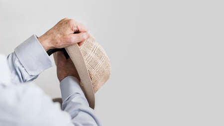 White hat hanging on the wall in the morning light. Minimalist modern interior