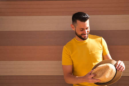 A young, handsome, blue-eyed, bearded man with a yellow T-shirt holds a hat in his hands. In the background a wall in shades of brown. The man smiles happily looking forward to the holidays.