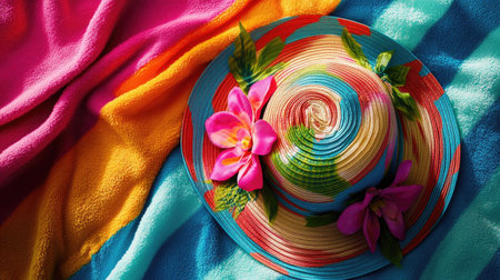 Detailed view of a colorful summer sunhat with wide brim and floral pattern, lying on a beach towel