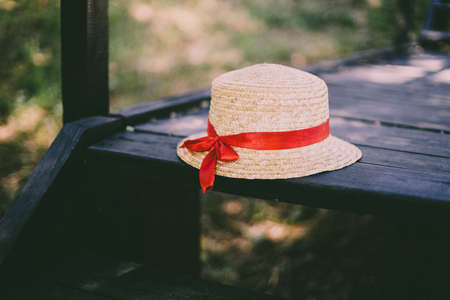 Summer straw hat with red ribbon lies on black wooden step in the park