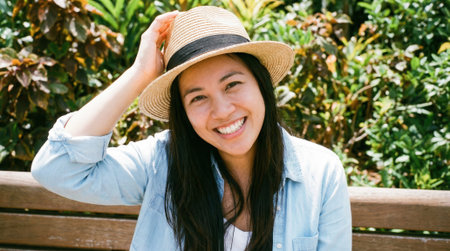 A beautiful young woman with a radiant smile sits on a bench in a park. She wears a summer hat and a denim shirt, enjoying the bright sunshine and lush green surroundings.