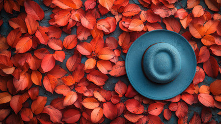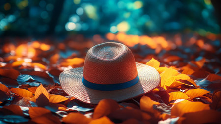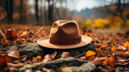 A warm scene of an autumn hat placed on vibrant fallen leaves, evoking the cozy essence of fall.