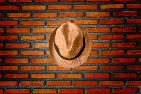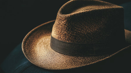 A bold composition featuring a classic brown hat placed on a dark textured surface, creating a refined and moody aesthetic.