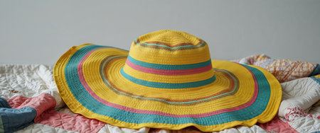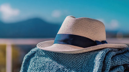 A delicate summer hat resting on a folded beach towel, clear blue sky in the background, high-definition, soft lighting --chaos 30 --ar 16:9 --v 6.1 Job ID: 2b0a1e14-28fa-4858-ab16-e9b2de06d5b9