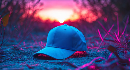 A blue baseball cap rests on the ground with a stunning sunset in the background, radiating warmth and the soft glow. The vibrant colors of sunset create a surreal effect.