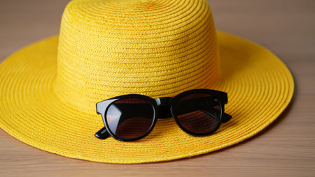 Yellow sun hat with sunglasses on wooden surface. generated by ai