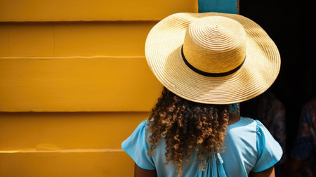 a girl sporting a vibrant yellow sunhat and turquoise jewelry, the bustle of the summer market around her resonating with holiday vibrancy.