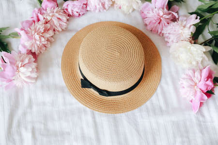 Women's striped summer romantic hat for beach holiday. Top view with copy space, flat lay