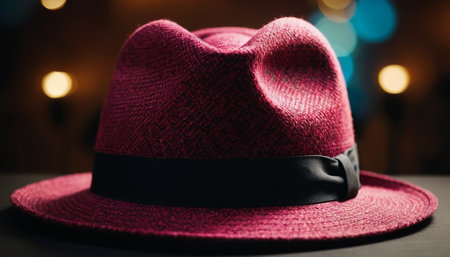 Red hat with black ribbon on the background of the night city.
