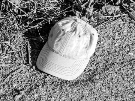 A person's baseball cap sits at the side of the road, abandoned, waiting to be rescued by a new owner.