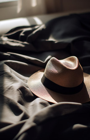 Casual showing straw fedora hat with dark ribbon band on draped fabric keywords: hat, straw, fedora, woven,...