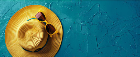 Bright yellow hat and stylish sunglasses placed on a vibrant blue background.