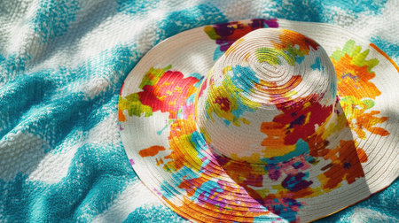 Detailed view of a colorful summer sunhat with wide brim and floral pattern, lying on a beach towel -