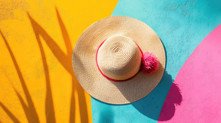 A playful wide-brimmed hat with pom-pom trim, photographed on a summery, vibrant background