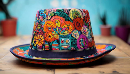 AI Generated. A colorful hat is laying on the ground next to a blanket