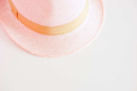 Pale pink female summer hat on white table. Top view. Copy space.