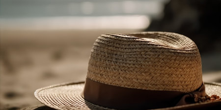 Straw hat on a sandy beach with the sea in the background