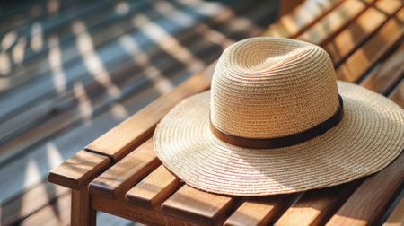 Straw hat on wooden bench in sunlight with shadow stripes
