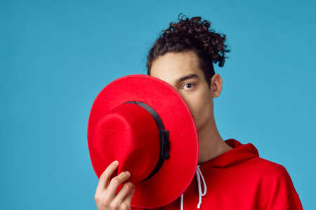 curly guy in a red sweater posing fashion modern hipster style