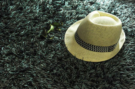 A White Fedora hat was on fur carpet background