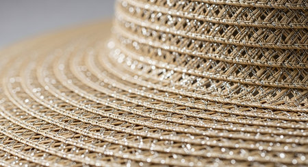 Detailed close up of a woven straw hat with shiny metallic threads and a blurred background