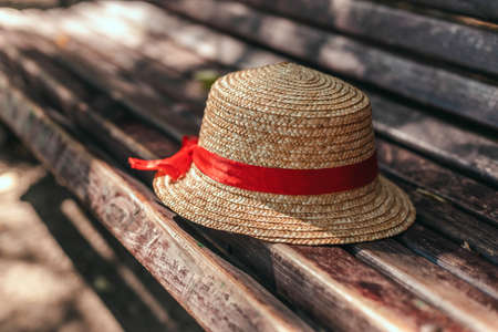 Straw hat placed on a wooden bench in a city park. Natural eco materials