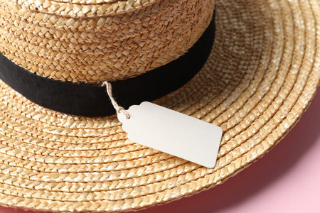 A close-up view of a straw sun hat featuring a black ribbon band and a wide brim. Clear details and vibrant co...