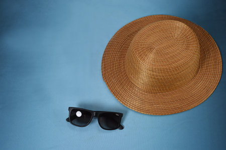 straw hat with sunglasses on a blue background Top view Copyspace Banner concept