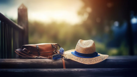 Hat and accessories on a wooden background. Travel concept. Generative AI.